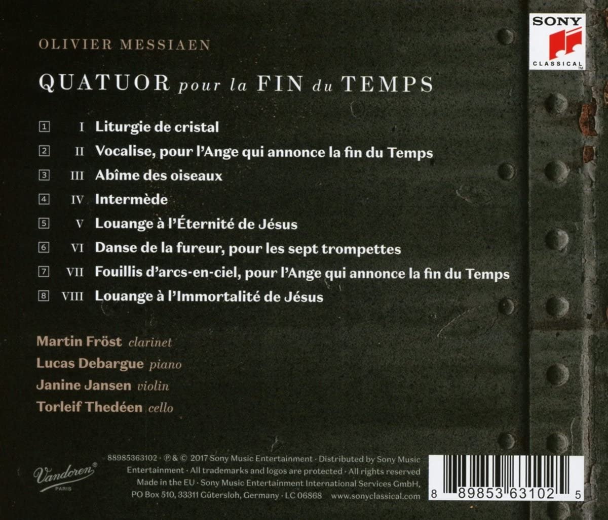 Presenting Messiaen's most original and poignant chamber work recorded by this sensational quartet: Martin Fröst, Lucas Debargue, Janine Jansen and Torleif Thedeen. Martin Fröst and Janine Jansen first met 16 years ago and the first piece they ever played together was the Quartet for the End of Time. Torleif Thedeen was also part of that group. This piece left them with a deep sense of connection, and now they record it together for the first time.