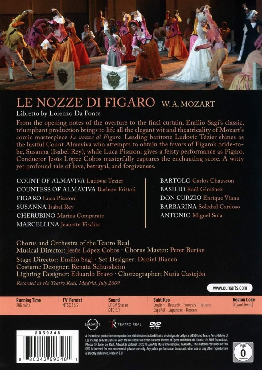 From the opening notes of the overture to the final curtain, Emilio Sagi’s classic, triumphant production brings to life all the elegant wit and theatricality of Mozart’s comic masterpiece “Le nozze di Figaro”. Leading baritone Ludovic Tézier shines as the lustful Count Almaviva who attempts to obtain the favors of Figaro’s bride-to-be, Susanna (Isabel Rey), while Luca Pisaroni gives a feisty performance as Figaro. Conductor Jesús López Cobos masterfully captures the enchanting score. A witty yet profound tale of love, betrayal, and forgiveness. Mozart’s Le nozze di Figaro was premiered in Vienna on 1 May 1786, just three years before the French Revolution. Add to this the fact that it was based on a politically subversive French play by Pierre Augustin Caron de Beaumarchais and one can see why the opera is often viewed as representing the collapse of a degenerate aristocracy (Count Almaviva) and the rise of the lower classes (Figaro). Figaro had nine performances in Vienna in1786, a reasonable number for the time, it was even more of a hit in Prague, where Mozart went to conduct it in early 1787. ...Le Nozze Di Figaro is widely considered among the greatest operas ever penned. It is a superb marriage of composer and librettist and features in the repertoire of all the great opera houses of the world. The sets in this production do it justice… - musicweb-international With: Ludovic Tézier, Barbara Frittoli, Luca Pisaroni, Isabel Rey, Marina Comparato, Jeanette Fischer, Carlos Chausson, Raúl Giménez, Enrique Viana, Soledad Cardoso, Miguel Sola