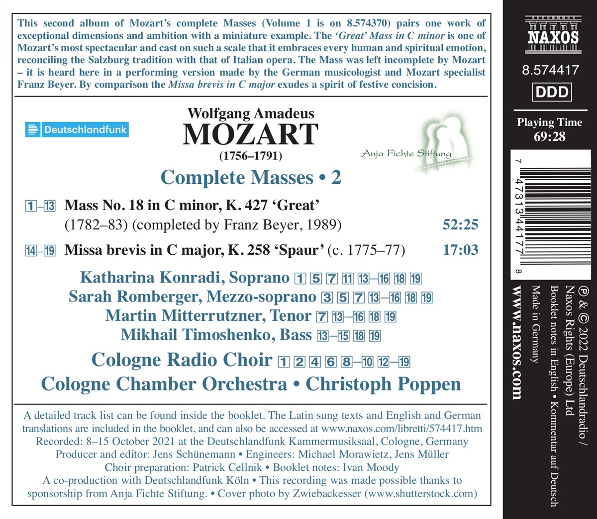 This second album of Mozarts complete Masses (Volume 1 is on 8.574370) pairs one work of exceptional dimensions and ambition with a miniature example. The Great Mass in C minor is one of Mozarts most spectacular and cast on such a scale that it embraces every human and spiritual emotion, reconciling the Salzburg tradition with that of Italian opera. The Mass was left incomplete by Mozart it is heard here in a performing version made by the German musicologist and Mozart specialist Franz Beyer. By comparison the Missa brevis in C major exudes a spirit of festive concision.