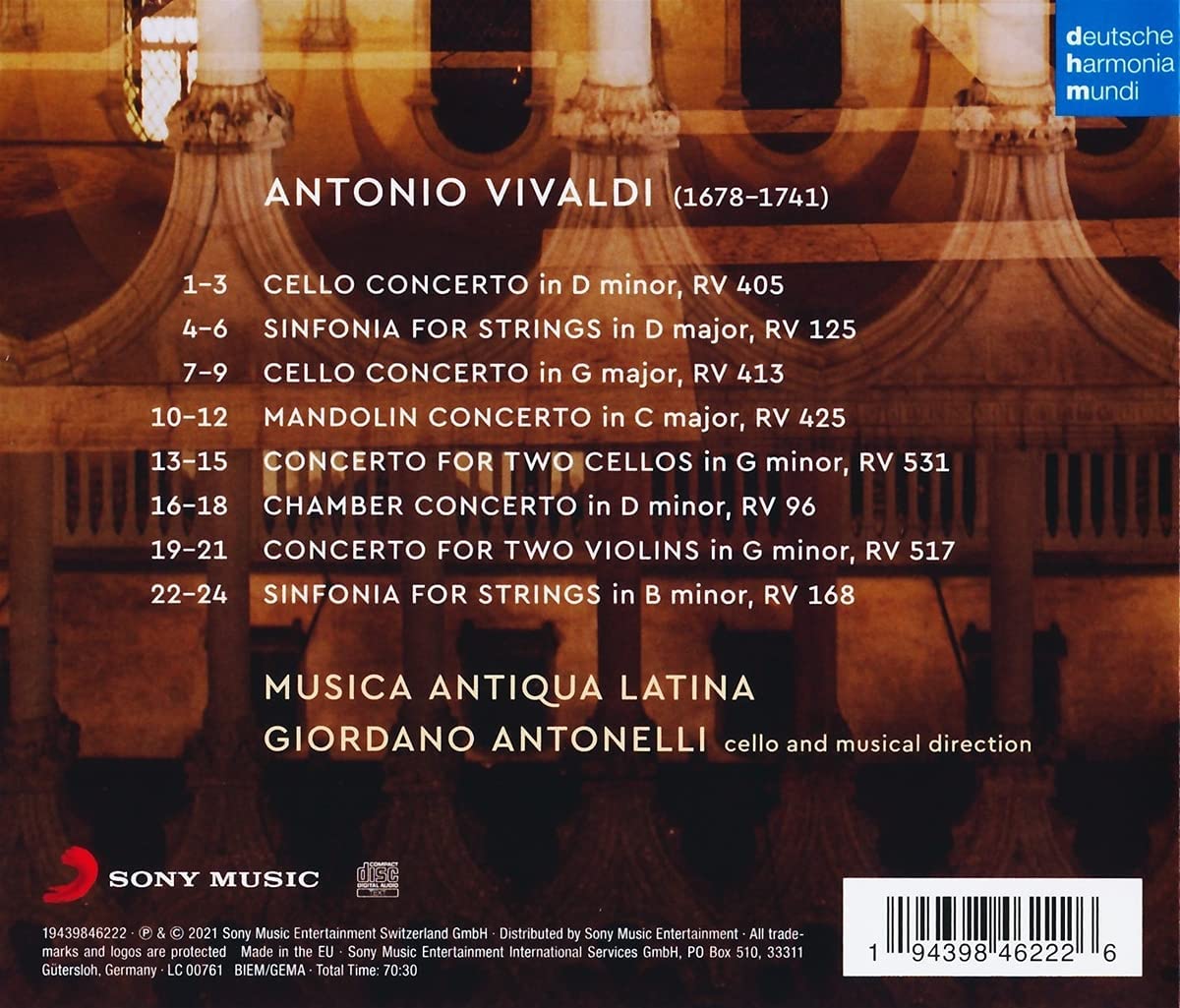 The Italian cellist Giordano Antonelli and his baroque ensemble Musica Antiqua Latina have recorded popular concerts - including the famous Mandolin Concerto RV 425 - as well as lesser-known concerts and symphonies by Antonio Vivaldi. The ensemble takes a different approach to Vivaldi's works: The influences of various cultures in Europe and the Middle East on Vivaldi's music are emphasized. The Sinfonia RV 125, for example, which remained almost unpublished, shows the influences of Slavic musical traditions with its syncopated accents. The cello concerto RV 413 and the concerto for flute, violin and bassoon RV 96 show characteristics of German musical traditions. The RV 517 concerto for two violins reflects clear northern European, but also Spanish styles. The Sinfonia RV 168 is also evidence of Vivaldi's continuous collaboration with musicians from Northern Europe. The third movement of this symphony, however, shows clear influences from the Balkans; this is performed by Giordano Antonelli with a long improvisation on the Greek lyre in the style of the Ottoman Taksim. Venice, where Vivaldi spent most of his life, has always been a metropolis where communities of different peoples met and shared their musical traditions. This album is set against this cultural background: Giordano Antonelli and his ensemble Musica Antiqua Latina allow the sound of cosmopolitan Venice to be heard in Vivaldi's works.
