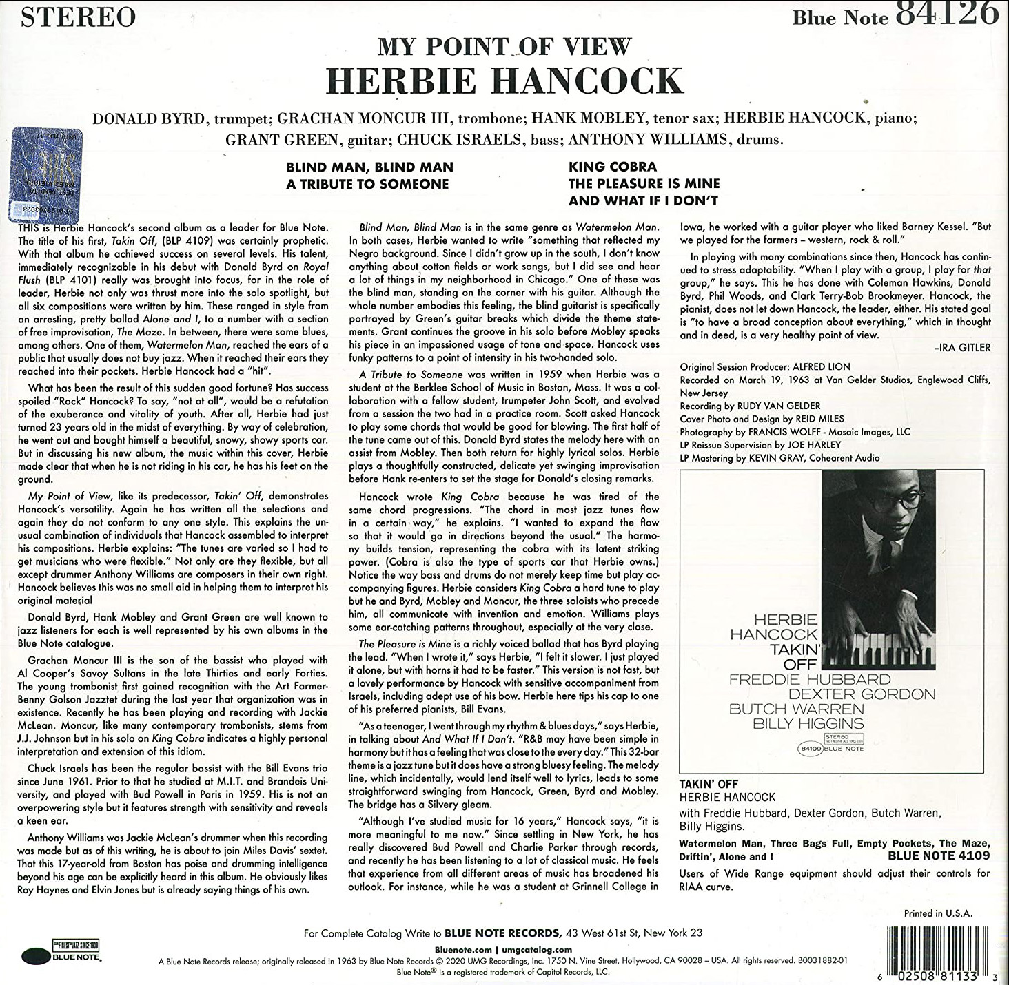 With an all-star lineup, 'My Point of View' is pianist and composer Herbie Hancock's remarkably assured second album. Featuring a program of Hancock compositions, this session from 1963 has a wondrous all-star cast: Donald Byrd on trumpet, Hank Mobley on tenor saxophone, Grachan Moncur III on trombone, Grant Green on guitar, Chuck Israels on bass, and Tony Williams on drums, who was just 17 at the time of this recording. The sheer musicality of 'My Point of View' is breathtaking, with Hancock demonstrating his arranging prowess. While 'Blind Man, Blind Man takes' its cue from Hancock's prior hit 'Watermelon Man,' this session also contains truly essential Hancock compositions such as 'King Cobra,' 'A Tribute To Someone,' and the bluesy 'And What If I Don't.'