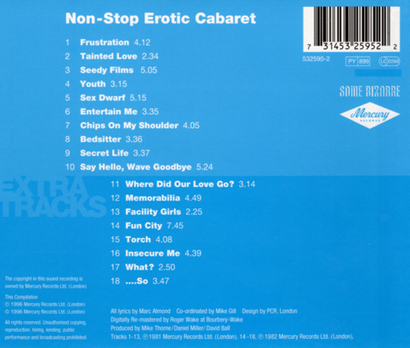 Remastered 1996 reissue on Mercury of the British new wave synth duo's debut album, first released in 1981 for the label & now with eight bonus tracks: 'Where Did Our Love Go?', 'Memorabilia', 'Facility Girls', 'Torch', 'Insecure Me', 'What?', 'Fun City' and '....So'. 18 tracks total from Marc Almond & Dave Ball, also featuring their top 10 cover of 'Tainted Love' and the hits 'Sex Dwarf' & 'Say Hello, Wave Goodbye'.