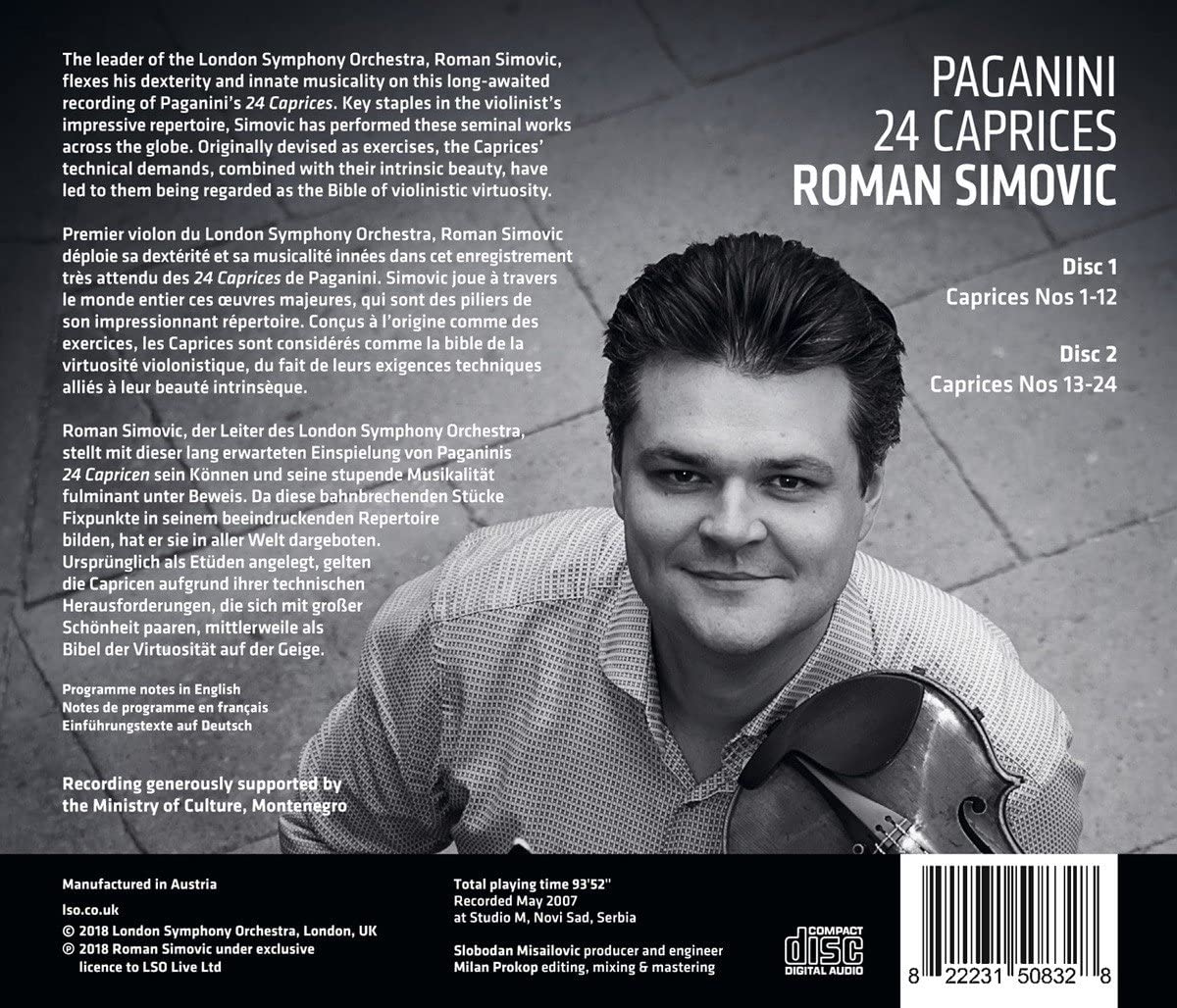 Roman Simovic, PAGANINI: 24 CAPRICES - For his debut solo album, the Leader of the London Symphony Orchestra showcases his virtuosity and innate musicality, navigating the technical and artistic challenges of Paganini's 24 Caprices for solo violin. Staples of the violinist's impressive repertoire, as a budding musician Simovic would practice these works daily in place of scales, and has gone on to delight audiences with performances across the globe. While Paganini's Caprices were intended to improve and strengthen technique, they are more commonly used to determine the wheat from the chaff, their demanding, high speed passages pushing players to their limits. With it's fast scales and arpeggios, double and triple stops, and left-hand pizzicato, the final caprice is widely considered one of the most technically challenging violin pieces ever written.
