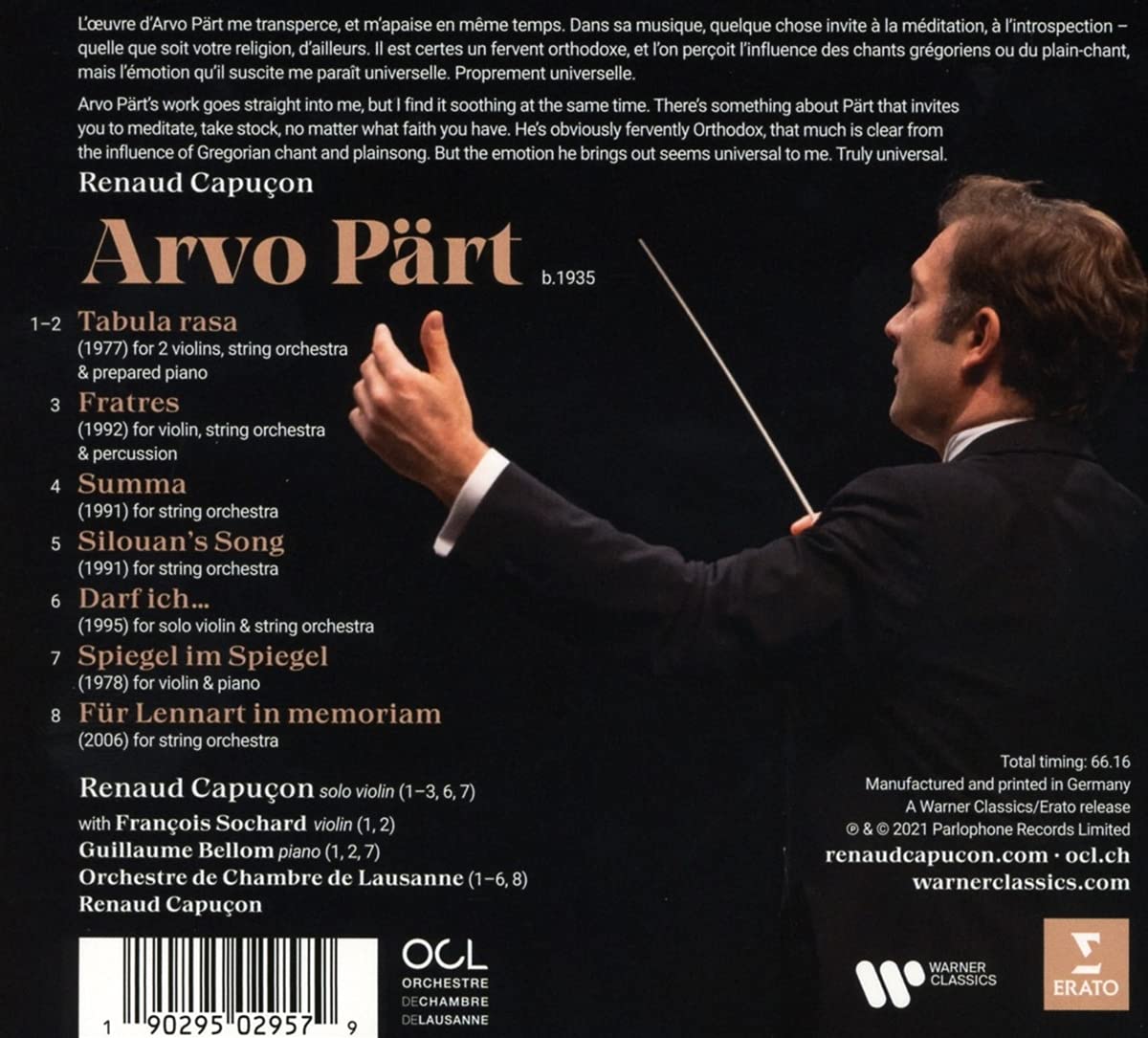 "Arvo Pärt's music takes us from darkness to light," says Renaud Capuçon. "It looks relatively simple on paper, but each note needs to have it's own life as it undergoes change. This music is not just relaxing - it has a depth and drama." In Autumn 2021 Renaud Capuçon becomes Artistic Director of the Orchestre de Chambre de Lausanne. His first recording with the ensemble is devoted to the Estonian composer Arvo Pärt and among the eight works on the album are Spiegel im Spiegel, Tabula Rasa and Silouan's Song.