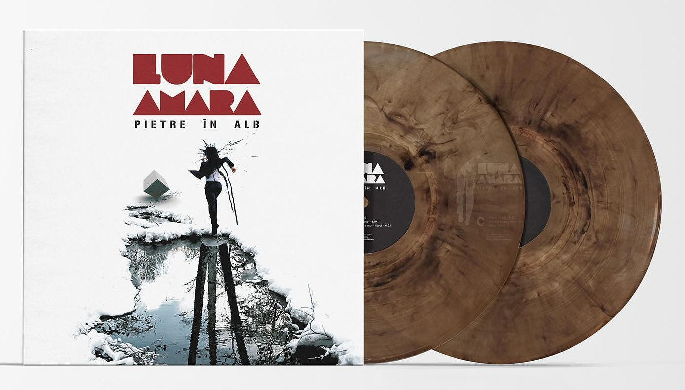 Albumul Luna Amară – Pietre în alb pe disc de vinil dublu 2xLP, new pressing 2025, heavy 180g, 33 rpm, culoare Marbled Black Smoke, copertă gatefold mat, sunet remasterizat pentru vinil. Timp total: 67 de minute.
