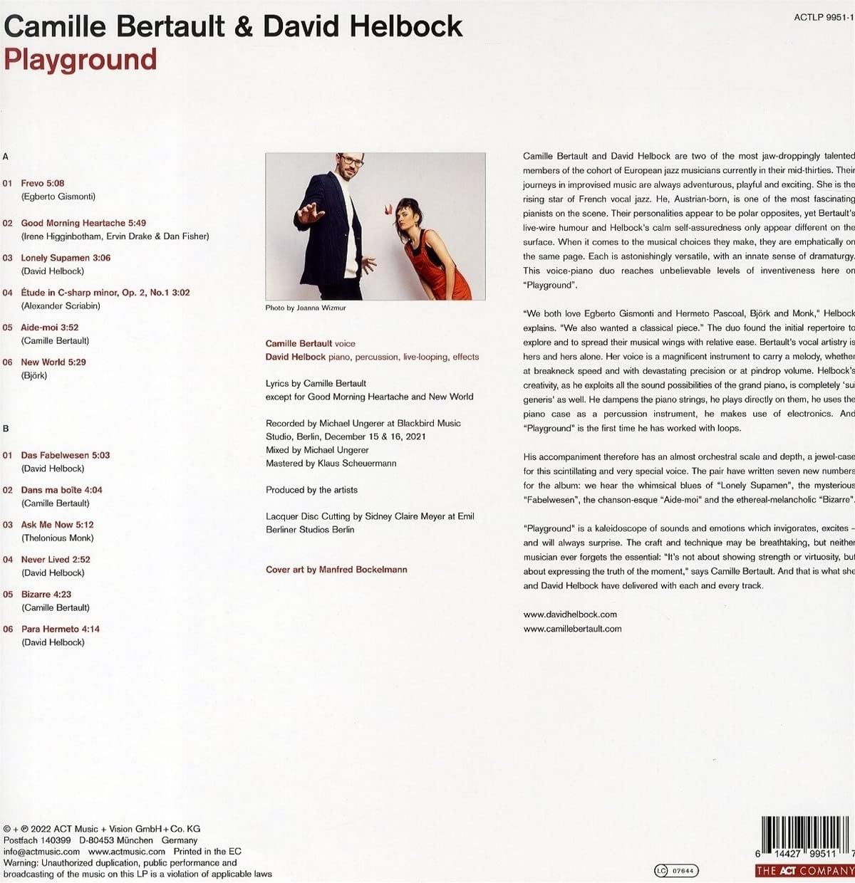 "Playground" is a kaleidoscope of sounds and emotions which invigorates, excites - and will always surprise. The craft and technique may be breathtaking, but neither musician ever forgets the essential: "It's not about showing strength or virtuosity, but about expressing the truth of the moment," says Camille Bertault. And that is what she and David Helbock deliver with each and every track.