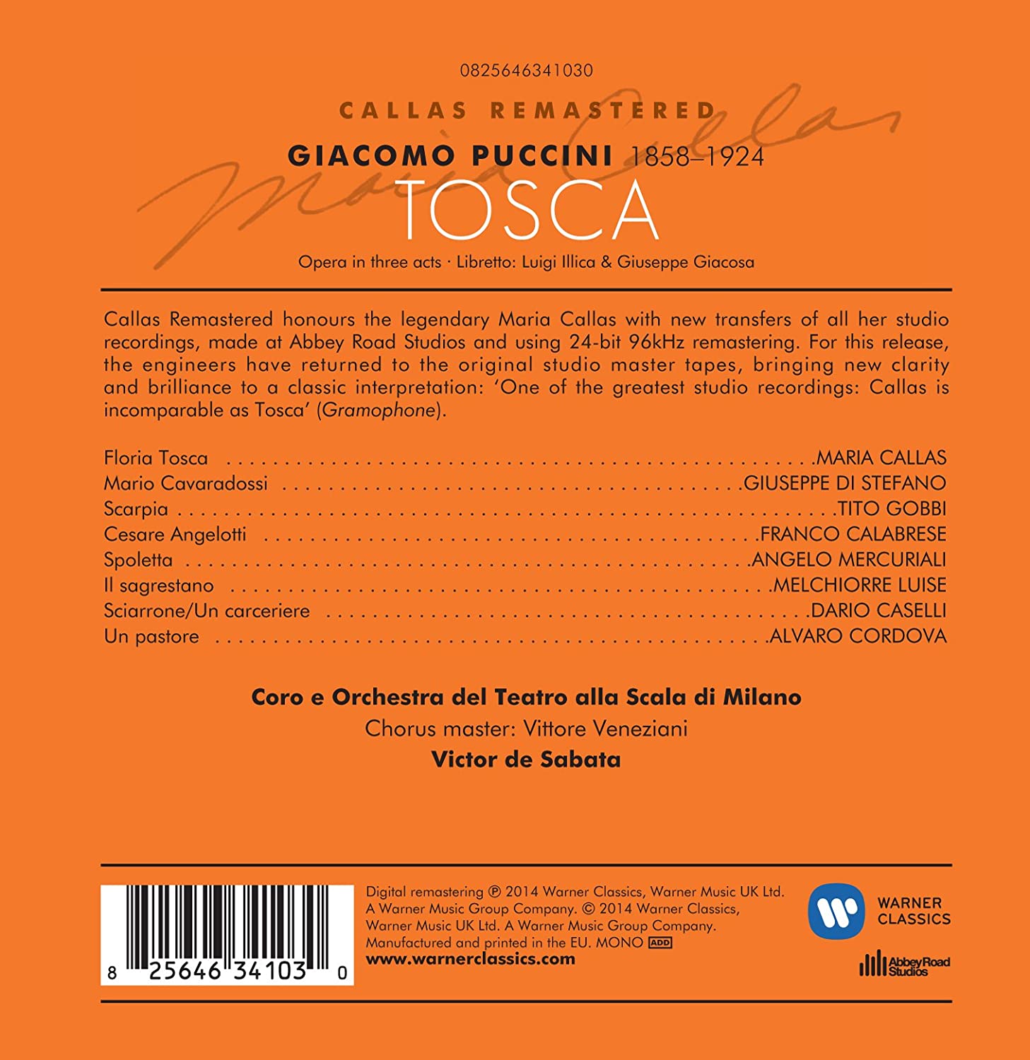 2014 Maria Callas remastered series reissue. With this Abbey Road 24-bit 96kHz remaster, engineers returned to the original master tapes, bringing new clarity & brilliance to her legendary studio recordings. This Tosca, made in 1953 with the forces of LaScala, is a landmark in recording history. Conducted with searing intensity by Victor de Sabata, it teams Callas with two of her closest colleagues, the tenor Giuseppe di Stefano and the baritone Tito Gobbi - a performer who could rival Callas in dramatic finesse and power. Tosca's aria 'Vissi d'arte' (I lived for art) has come to be seen as Callas's personal manifesto.
