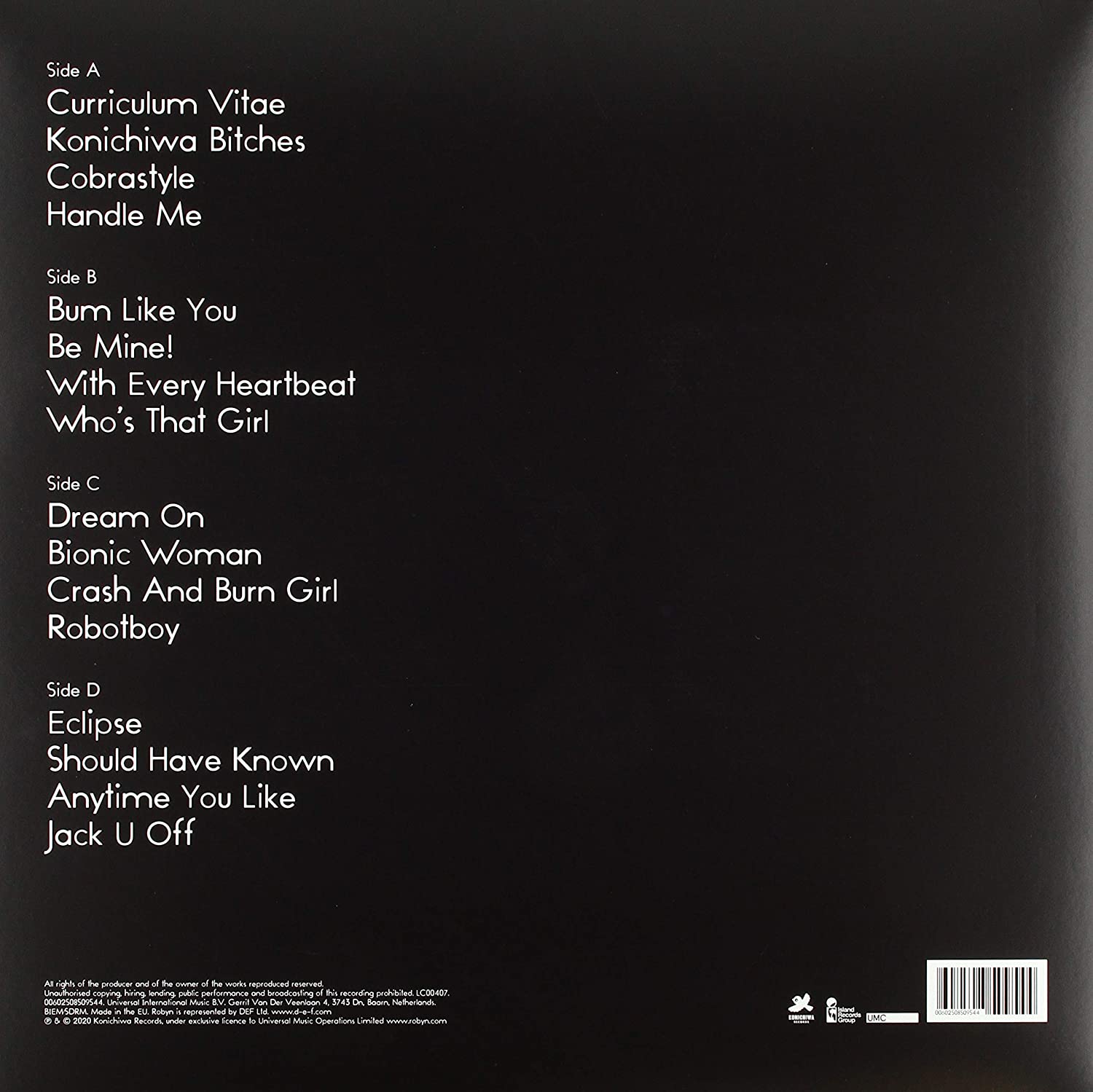 Originally released in 2005, this is the first time Robyn has been released on vinyl. The album features the hit singles Be Mine and With Every Heartbeat. This release for Record Store Day has a newly configured track listing, featuring previous bonus tracks Jack You Off and Dream On, and also features the original album cover artwork.