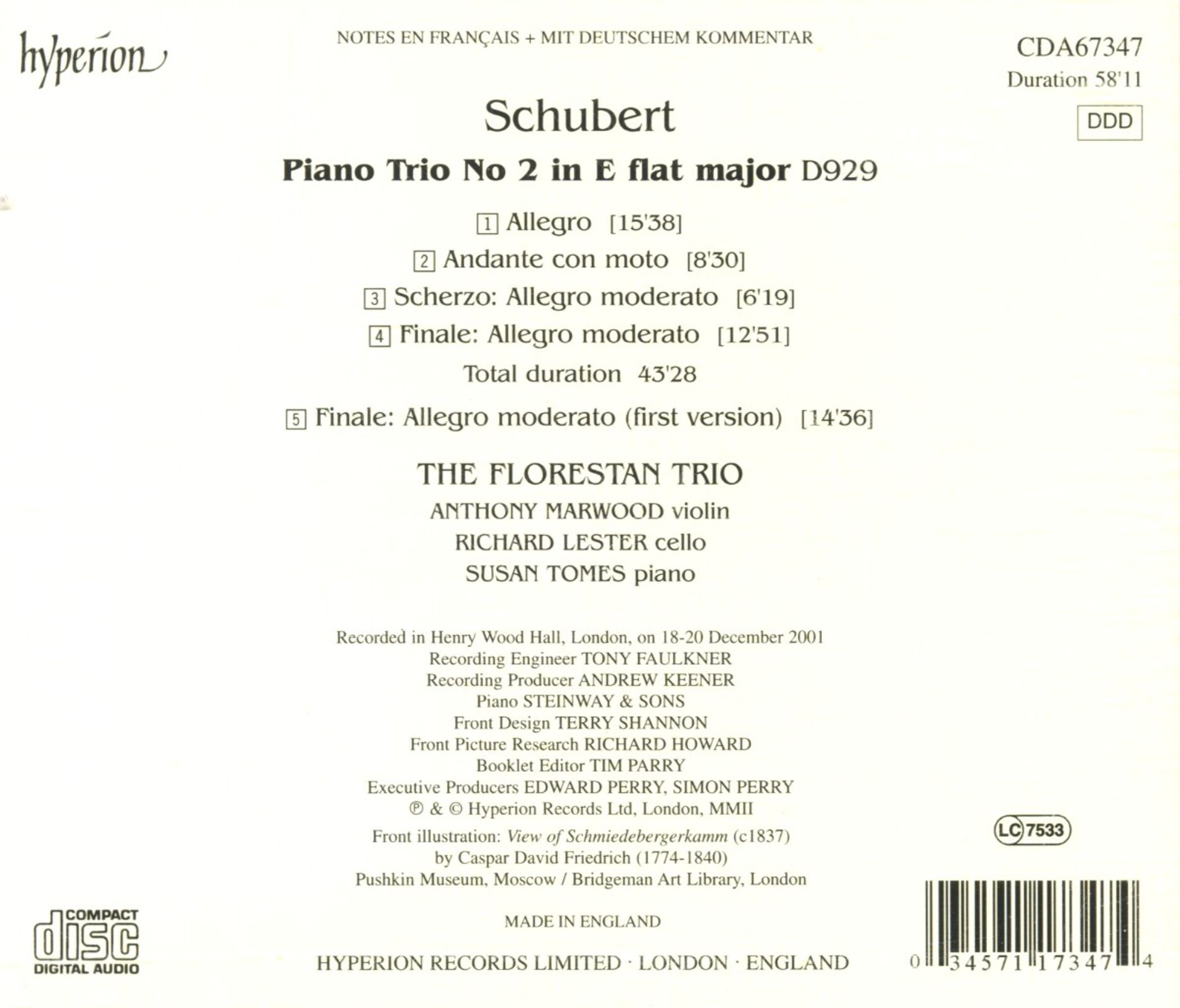 Piano Trio No 2 In E Flat Major, D929Allegro - 15:38Andante Con Moto - 8:30Scherzo: Allegro Moderato - 6:19Finale. Allegro Moderato (Final Version) - 12:51Finale. Allegro Moderato (First Version) - 14:36