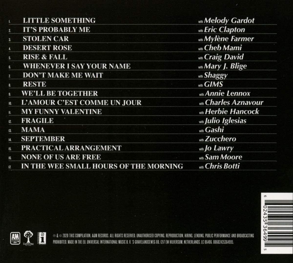 From the melismatic longing of “Desert Rose” with Rai music singer Cheb Mami and sultry groove of “It’s Probably Me” with Eric Clapton to the uplifting 44/876 with Shaggy, which yielded his most recent and 17th GRAMMY award, Sting’s collaborations have become nothing short of cornerstones in the canon of popular music. To celebrate some of these joint-works, he has compiled a special collection to include some of his most beloved duets with collaborators such as Mary J. Blige, Herbie Hancock, Eric Clapton, Annie Lennox, Charles Aznavour, Mylène Farmer, Shaggy, Melody Gardot, Gashi and more. The Duets album will also include the brand new, never-before-released song, “September” with Italian icon Zucchero, produced by Sting himself and mixed by 4-time Grammy Award winner Robert Orton.
