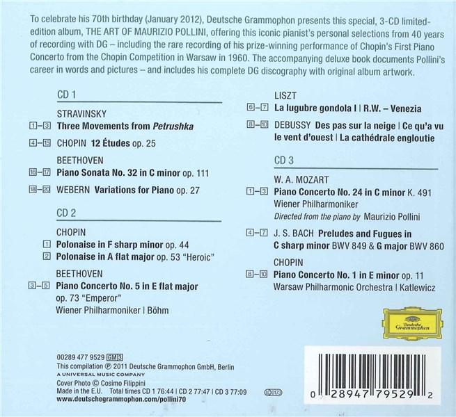 The accompanying book, 120 pages in full colour, includes a specially-commissioned introduction by US critic Jed Distler, many photos from all stages of Pollini’s career (plus a selection of childhood photos), and a complete full-colour discography (also including alternative covers).