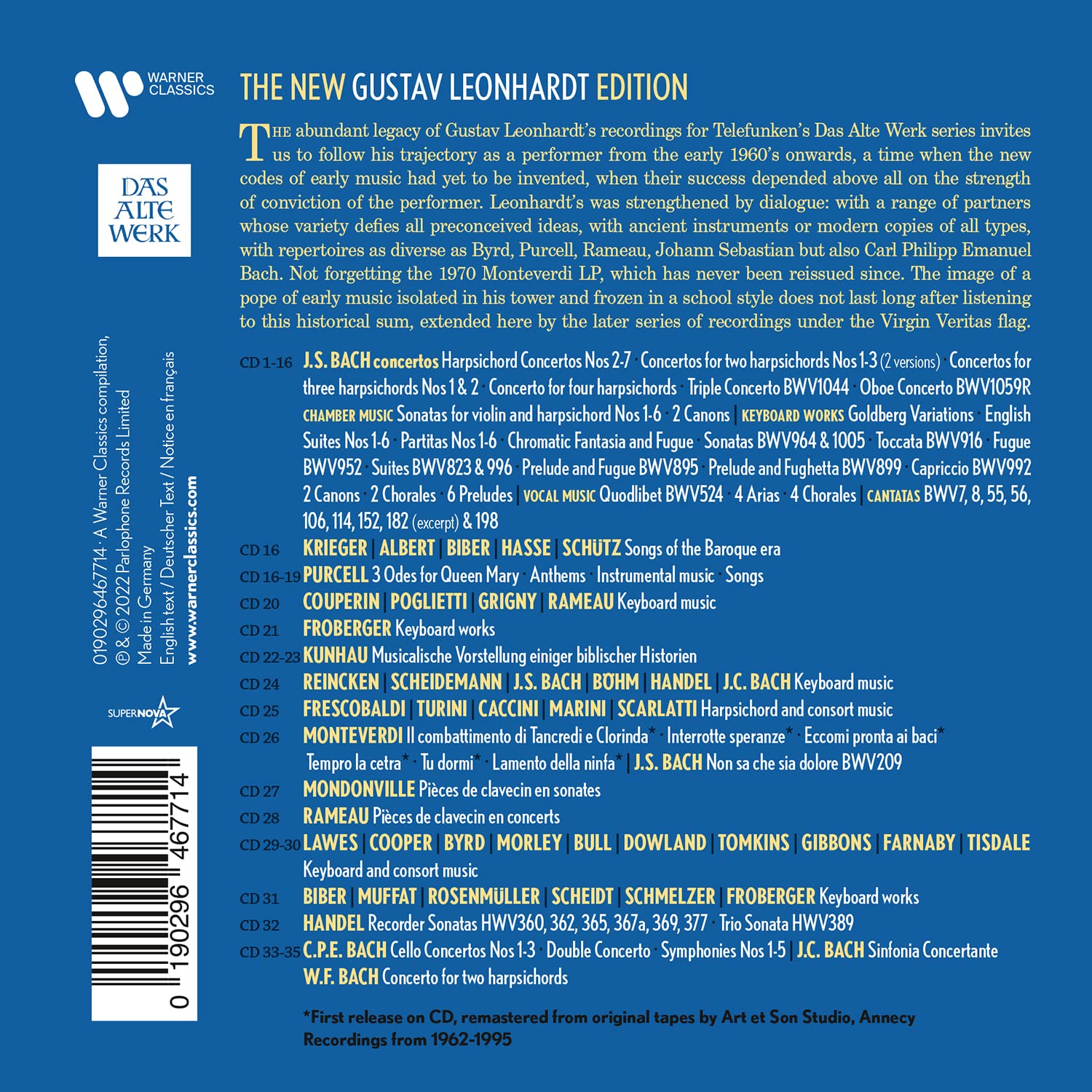 CD 1-16: J.S. BACH concertos Harpsichord Concertos Nos 2-7 Concertos for two harpsichords Nos 1-3(2 versions) Concertos for three harpsichords Nos1& 2 Concerto for four harpsichords Triple Concerto BWV1044 Oboe Concerto BWV1059R CHAMBER MUSIC Sonatas for violin and harpsichord Nos 1-6 2 Canons KEYBOARD WORKS Goldberg Variations English Suites Nos1-6 Partitas Nos 1-6 Chromatic Fantasia and Fugue Sonatas BWV964 & 1005 Toccata BWV916 Fugue BWV952 Suites BWV823 & 996 Prelude and Fugue BWV895 Prelude and Fughetta BWV899 Capriccio BWV992 2 Canons 2 Chorales 6 Preludes VOCAL MUSIC Ouodlibet BWV524 4 Arias 4 Chorales CANTATAS BWV7, 8, 55, 56, 106, 114, 152, 182 (excerpt) & 198