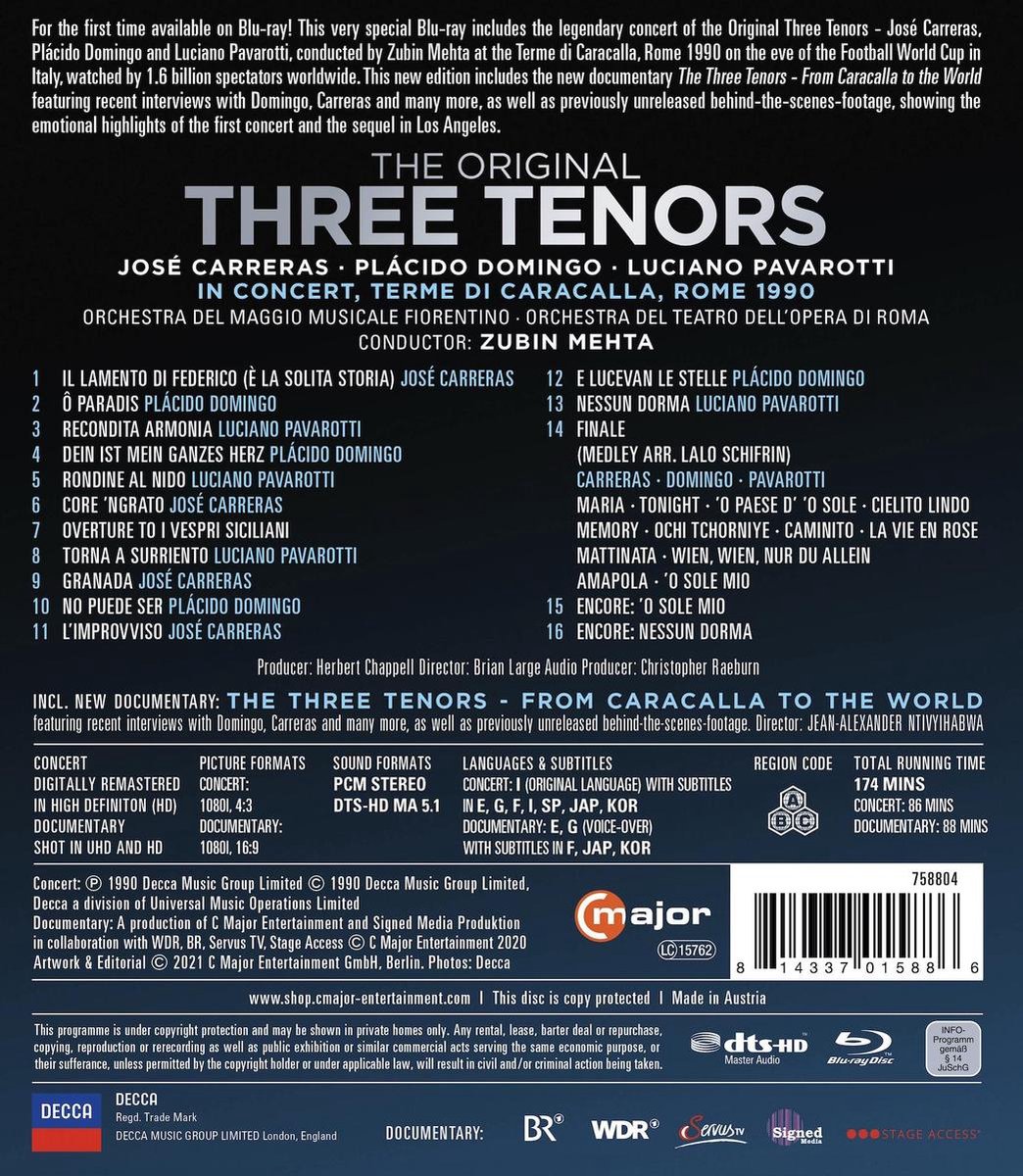 This very special Blu-ray includes the legendary concert of the Original Three Tenors - José Carreras, Plácido Domingo and Luciano Pavarotti, conducted by Zubin Mehta at the Terme di Caracalla, Rome 1990 on the eve of the Football World Cup in Italy, watched by 1.6 billion spectators worldwide. For the first time available on Blu-ray, digitally remastered! This edition includes the new documentary The Three Tenors - From Caracalla to the World featuring recent interviews with José Carreras, Plácido Domingo, Zubin Mehta, Pavarotti‘s widow Nicoletta Mantovani, Lalo Shifrin, Brian Large, Mario Dradi, Paul Potts, Sir Bryn Terfel, Norman Lebrecht, Didier de Cottignies and many more. Previously unpublished backstage material shows the tenors unadorned and offers a fascinating insight into what takes place beyond the spotlight in Rome, 1990 and the sequel in Los Angeles, 1994. The film takes a completely new look at the concert legends. For the first time, they talk about José Carreras‘ struggles with leukemia, their rivalries and friendships, their spectacular contract poker and life as an opera star.
