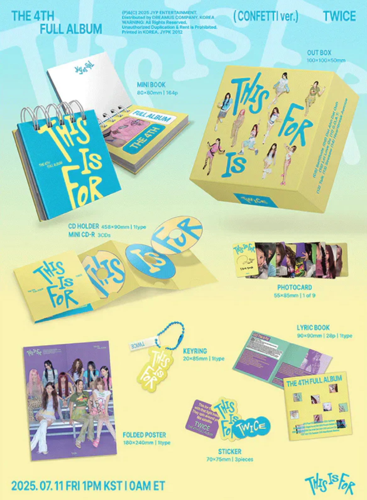 The group that is truly one-in-a-million, your favourite girl group TWICE is back with their 4th studio album titled 'THIS IS FOR'! Making global history as the girl group to do it all and coming up on 10 years together, 'THIS IS FOR' is a celebration album for TWICE and ONCE. Available in a 'CONFETTI ver.'.