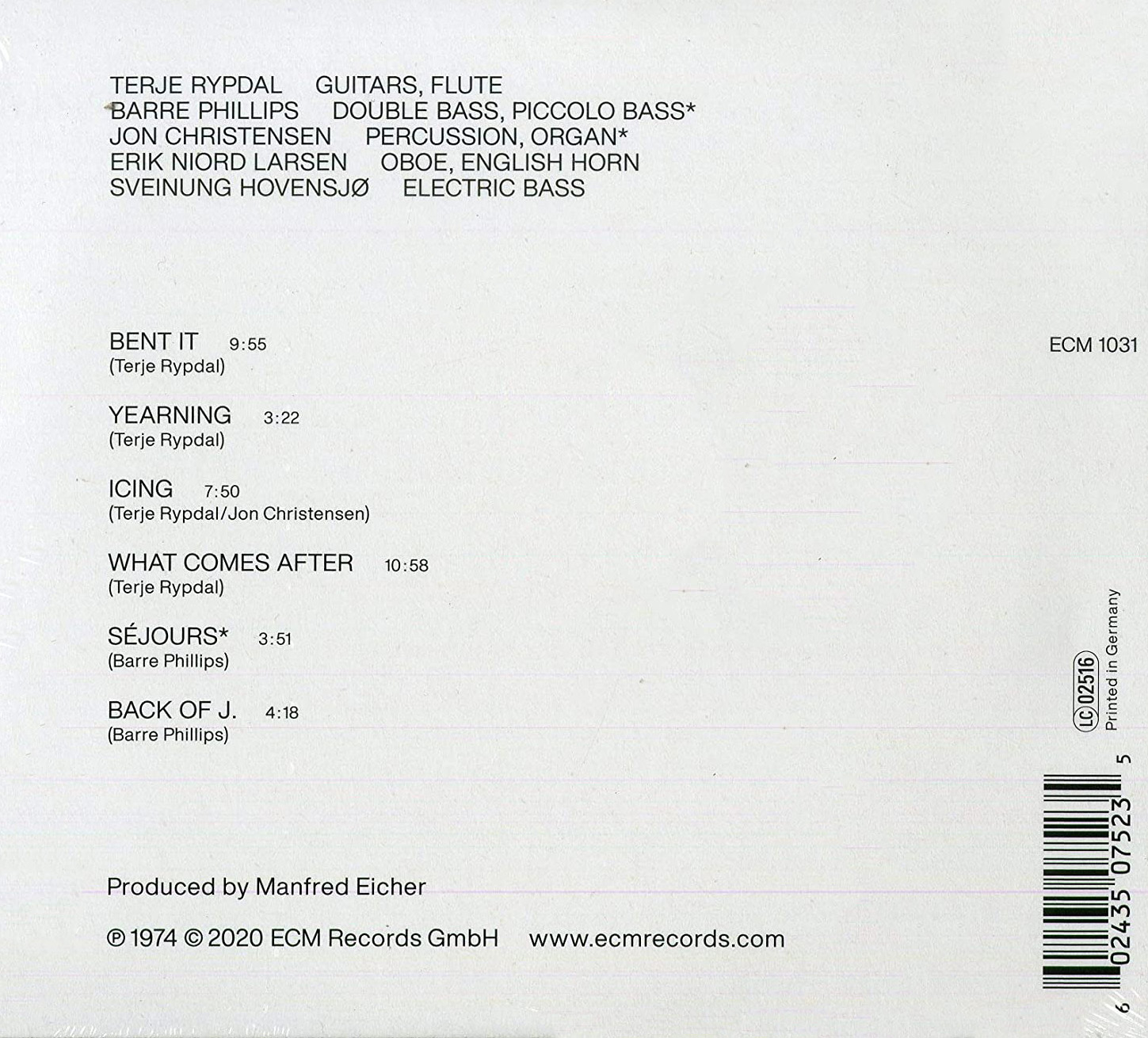 Following on from the release of Terje Rypdal's widely acclaimed new album Conspiracy, ECM now reissues four Rypdal recordings from the 1970's albums which helped to establish the Norwegian guitarist as a truly original force in creative music. Terje Rypdal / What Comes After. Terje Rypdal: guitars, flute; Barre Phillips: double bass, piccolo bass; Jon Christensen: drums, percussion, organ; Erik Niord Larsen: oboe, English horn; Sveinung Hovensjo: bass guitar (1973) What Comes After introduced a new alliance with American bassist Barre Phillips whose freely creative arco playing is often the second lead voice (two of the compositions are also Barre's). The unorthodox line-up includes contributions from powerhouse bass guitarist Sveinung Hovensjo, an important collaborator throughout the 70s (in the Odyssey band and other ensembles), and from classical oboist Erik Niord Larsen. Rypdal, Phillips and Christensen periodically played completely improvised concerts in 1973, and free music's sense of anything-can-happen also influences What Comes After. In this spirit, Jon Christensen's instrumental responsibilities extend, uncharacteristically, to playing organ on "Sejours", a piece which also features Terje on flute. The concluding "Back of J," is developed as an elegant rubato ballad featuring Phillips's bass, Rypdal's acoustic guitar, and Christensen's cymbals. From moment to moment, the soundscape changes on What Comes After, making it an album that invites repeated investigation to unlock its mysteries.
