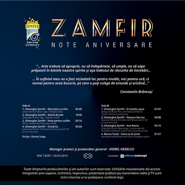 GHEORGHE ZAMFIR, unul dintre cei mai remarcabili artiști ai planetei, autor a peste 300 de lucrări în stil folcloric, cameral, coral, vocal, instrumental şi simfonic, cu vânzări de peste 120 de milioane de discuri pe toată planeta și 160 de albume înregistrate, recompensat cu 90 de discuri de aur şi de platină şi nenumarate distincţii şi onoruri la nivel mondial, merită cu prisosință o nouă producție-vinil. După o pauză de mai mult de 30 de ani iată un LP, produs integral în Franța. Acesta este live de pe scena Ateneului Român, în concertul Aniversare - 50 de ani pe scenele lumii.