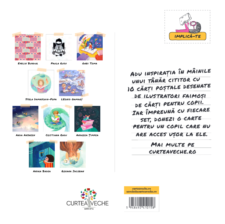 Adu inspirația în mâinile unui tânăr cititor cu 10 cărți poștale desenate de ilustratori faimoși de cărți pentru copii. Iar împreună cu fiecare set, donezi o carte pentru un copil care nu are acces ușor la ele.
