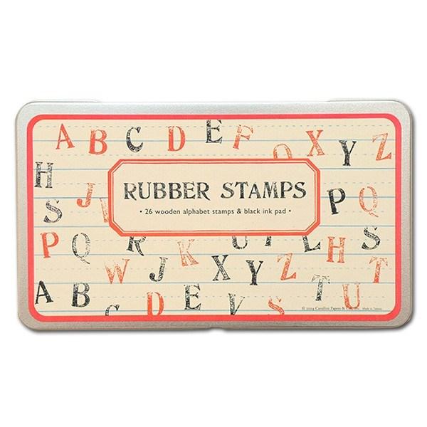 26 assorted wood-mounted individual alphabet stamps packaged in 8" x 4 1/2 " x 3/4" metal tin includes black ink pad