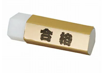 Gumă de sters învelită într-o folie aurie, cu mesaj în limba japoneză despre succes și prosperitate.
