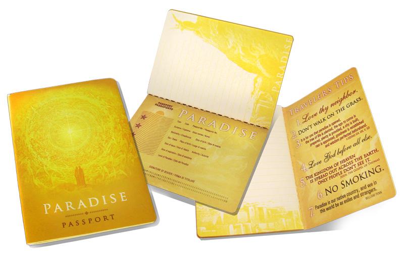 Imagine this scenario: You've reached the end of your life and see that welcoming bright light at the end of the tunnel. As you emerge, you behold Paradise in all its glory spread out before you. But as you start to enter, you're stopped by some uniformed official demanding to see your Paradise Passport. Would that stink, or what? And that's why we made the Paradise Passport -- It's an attractive and realistic passport that's guaranteed to grant easy access to Paradise. Just flash this baby and you'll have total access to everything Paradise has to offer -- rolling hills, fields of flowers, babbling brooks, etc. (Now that we think about it, Paradise sounds sort of dull. But, thankfully, the Paradise Passport is also useful for getting the hell out of there. And it also makes a lovely notebook for the earthly realm.)