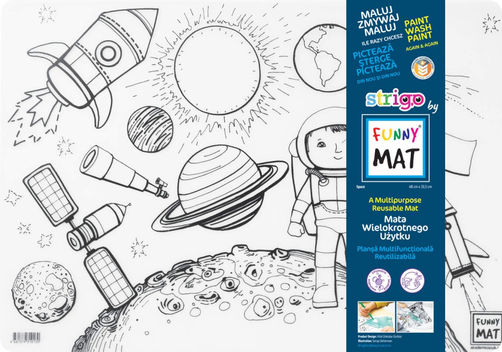 Funny Mat "Spatiu" de la Strigo este un covoraș transparent, impermeabil și reutilizabil, conceput pentru a proteja suprafețele în timpul activităților creative ale copiilor.