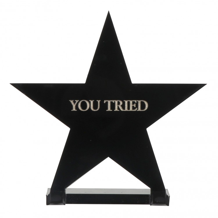 Un semn pentru birou amuzant în formă de stea, purtând mesajul „You tried”.