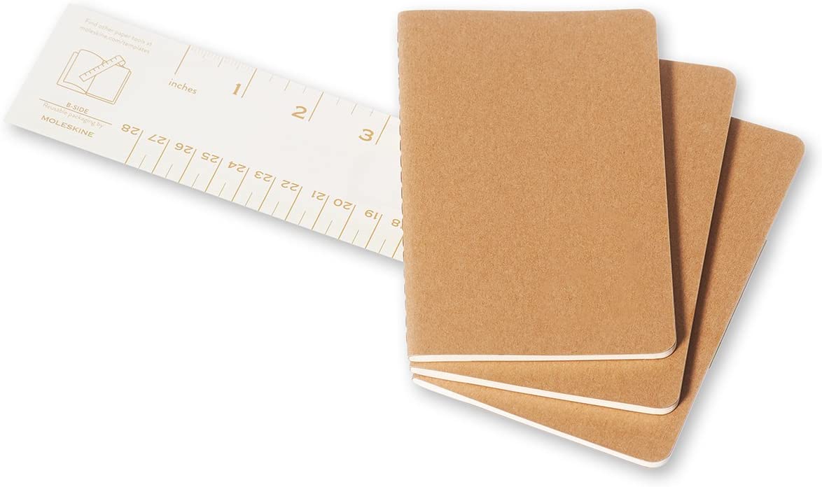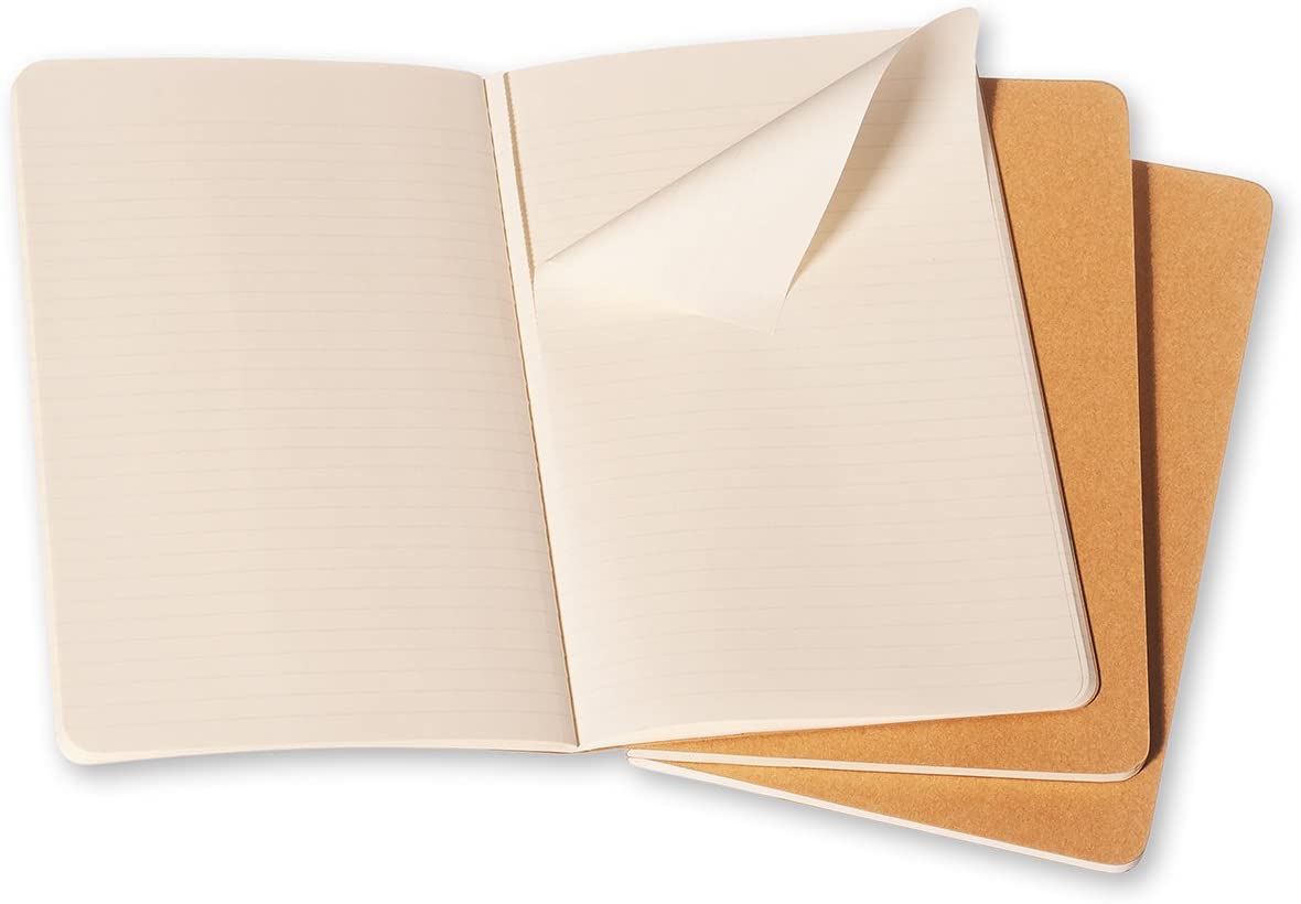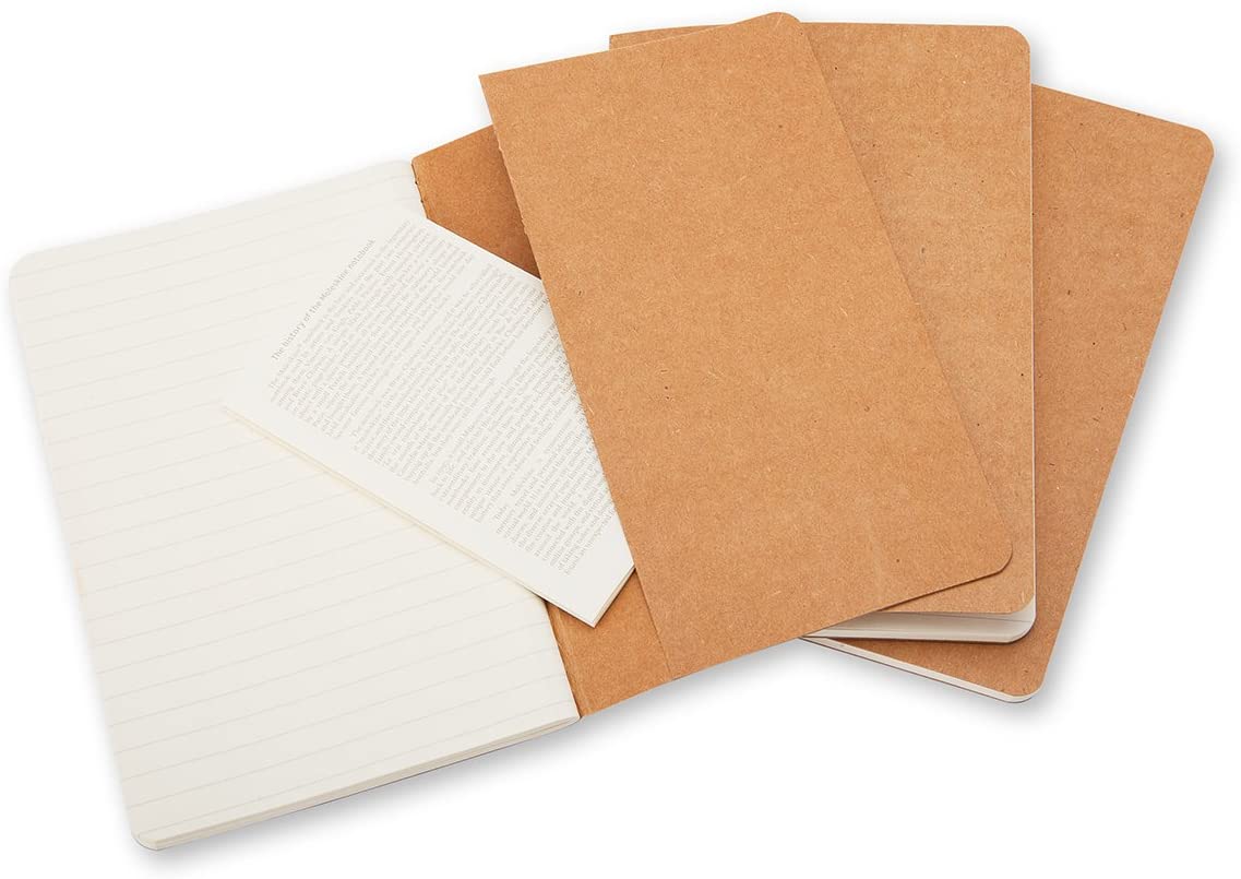 The Moleskine Cahiers are journals with a flexible heavy-duty cardboard cover in buff with visible stitching on the spine. The last 16 sheets are detachable and there is a pocket for loose notes. Each set of 3 pieces includes the Moleskine history. With acid free paper ruled pages. Set of 3.