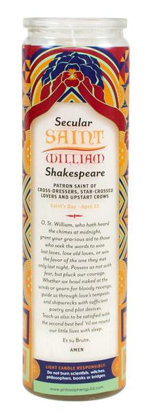 Show your devotion to William Shakespeare, the patron saint of cross-dressers, star-crossed lovers, and upstart crows, with this colorful votive! Even when the stars hide their fires, your life can be brilliant. Put this candle on your writing desk! Keep it handy for those trysts with the Dark Lady!