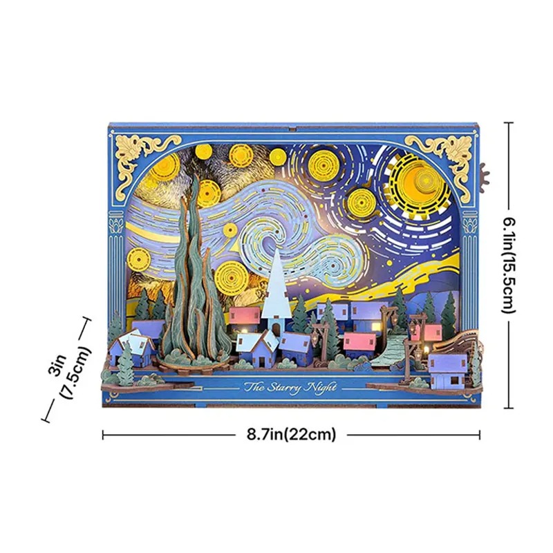 Puzzle-ul 3D din lemn The Rowood Starry Night prezintă o priveliște de peisaj a unui amurg liniștit, văzut dintr-o perspectivă diferită. Norii imenși se rotesc și se îmbină cu cerul deasupra unui sat tăcut și adormit, în timp ce elemente jucăușe, precum stelele și luna acționate de un mecanism cu rotițe, un chiparos rotativ și o roată de căruță, completează acest kit de dioramă din lemn.