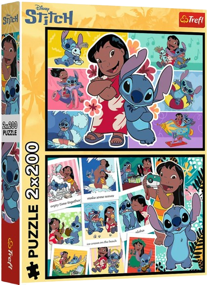 Setul de puzzle "Lilo & Stitch – Viața veselă a lui Stitch" de la Trefl include două puzzle-uri a câte 200 de piese fiecare, prezentând colaje colorate cu personajele îndrăgite din animația Disney "Lilo & Stitch".