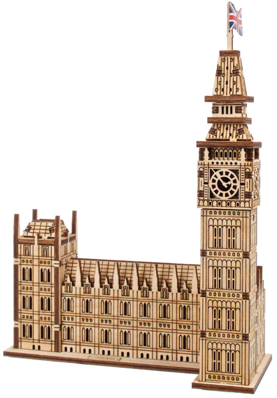 Modelul Ugears Big Ben, cu o sectiune a Caselor Parlamentului, din colectia Orase ale Lumii Ugears, este un model DIY din lemn la scara 1:530 a iconicului turn cu ceas cu dimensiuni de 137 x 181 x 66 mm.