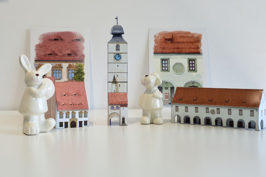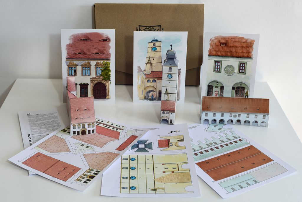 * 3 planșe ale unor clădiri istorice, care pot fi decupate, îndoite și lipite astfel încât să se transforme în miniaturi 3D: Turnul Sfatului, Casa Artelor și Casa Haller.