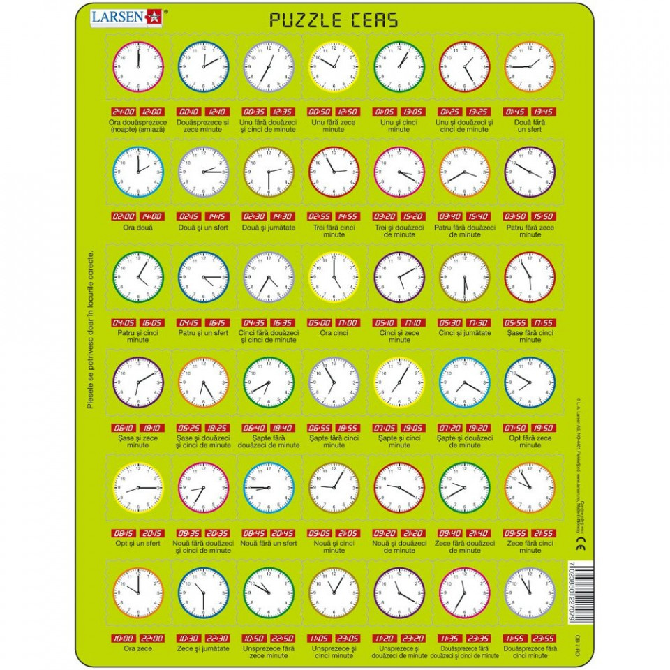 Puzzle Ceas Analogic are 42 de piese cu cate un ceas pe fiecare, toate aratand cate o ora diferita. Sub fiecare piesa este scrisa ora in cifre si cuvinte. Fiecare piesa se potriveste numai pe locul potrivit.