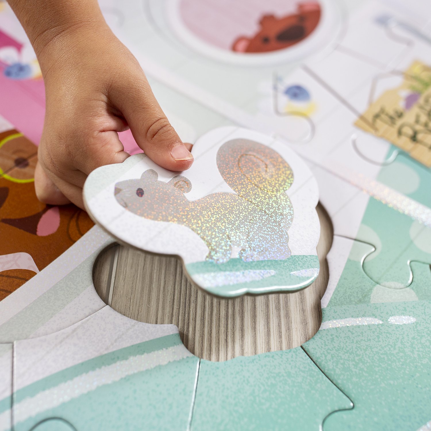 Piesele de puzzle sunt groase si rezistente, include piese cu forma unica, cum ar fi o veverita.