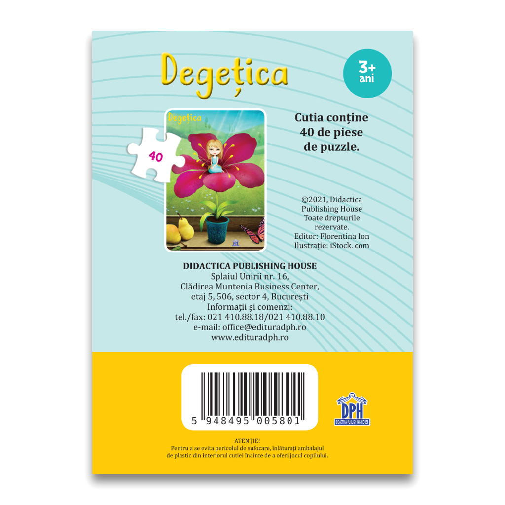 Acest puzzle conține 40 de piese și îi face pe copii să observe și să învețe cum să construiască imaginea personajului preferat. Degețica, fetița cât un degețel, născută dintr-o lalea, este unul dintre cele mai cunoscute și îndrăgite personaje de basm în rândul copiilor din lumea întreagă.