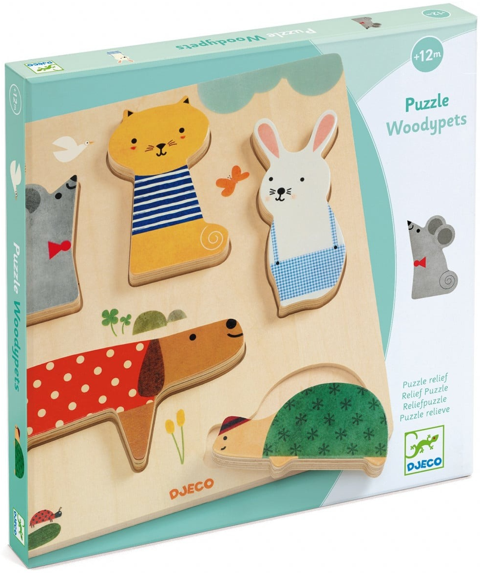 WoodyPets este un puzzle din lemn simplu, cu tema animalelor de companie. Piesele cu profil ridicat sunt perfecte pentru a se juca copiii.