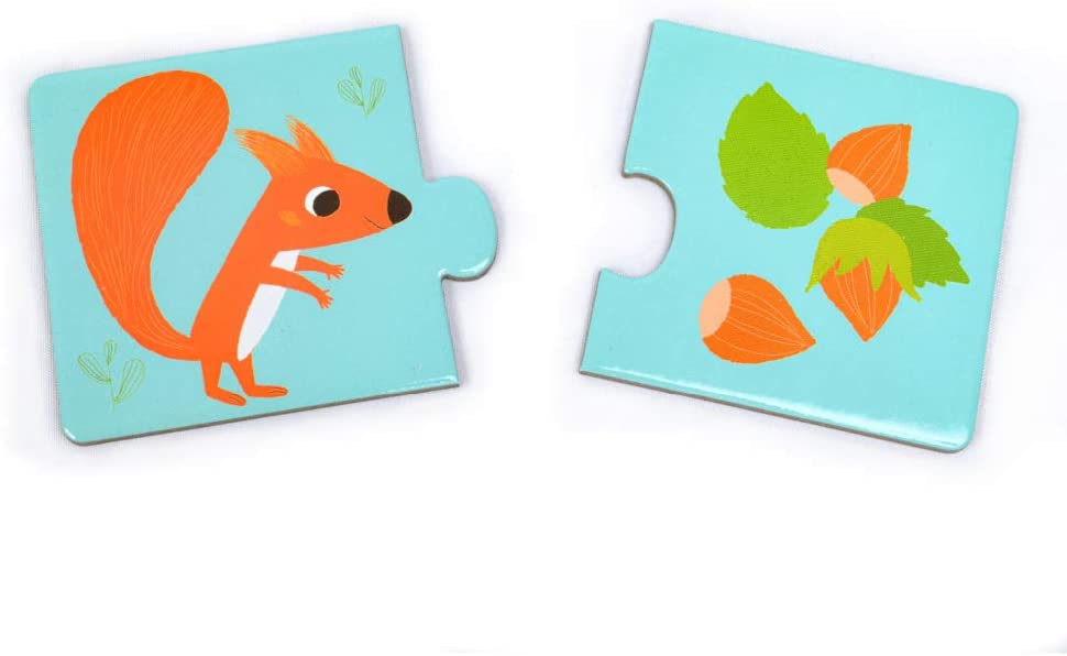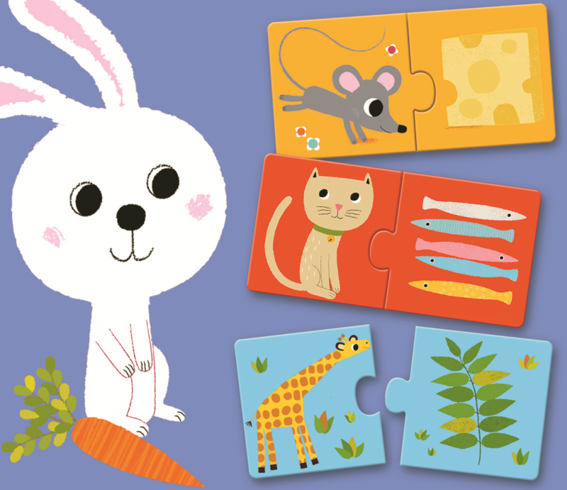 10 puzzle-uri din câte 2 piese, cu animale și hrana lor preferată.