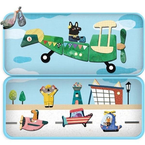 Acest puzzle magnetic conține 30 de piese magnetice care se atașează pe cutia metalică cu tematica Avioane.