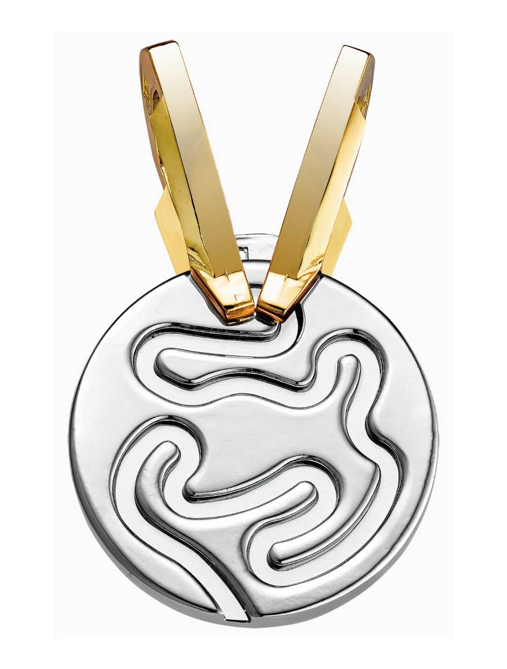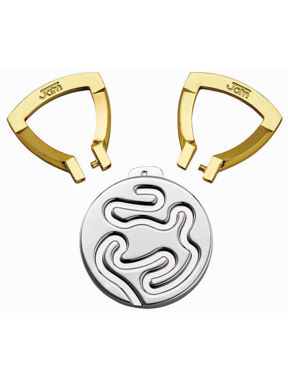 Acest nou joc de inteligență prezintă două inele de aur care se mișcă liber pe calea trasată în interiorul discului metalic plat.