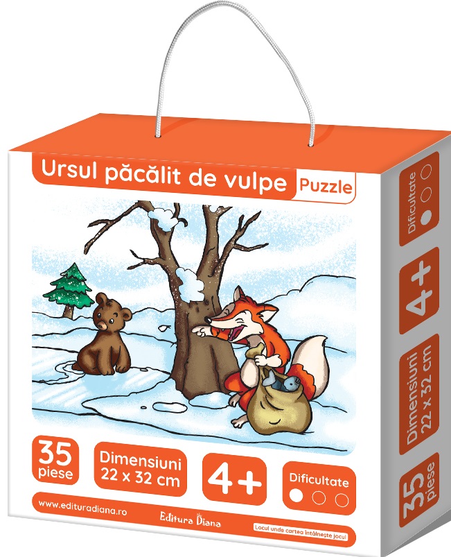 Puzzle-urile sunt unele dintre cele mai apreciate jocuri educative pentru copii. Ele fac viața copiilor mai frumoasă, stimulându-le atenția și spiritul de observație. Totodată, jocurile de puzzle le antrenează copiilor răbdarea și le dezvoltă vederea în spațiu și de ansamblu. Prin intermediul lor, copiii vor descoperi personaje îndrăgite și scene din cele mai iubite povești. Copiii vor adora să facă acest puzzle! Puzzle-ul „Ursul păcălit de vulpe” conține 35 piese. Dezvoltă coordonarea mână-ochi, motricitatea fină și gândirea logică. Vârsta: 4+. Dimensiuni puzzle asamblat: 22 x 32 cm.