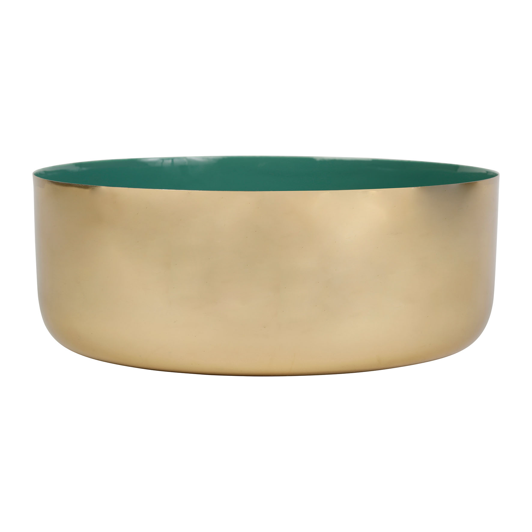 Un bol elegant, din metal, in nuante de auriu si verde, poate servi la depozitarea fructelor.