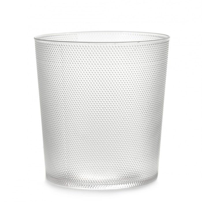 Pahar din sticlă transparentă cu model punctat în exterior.