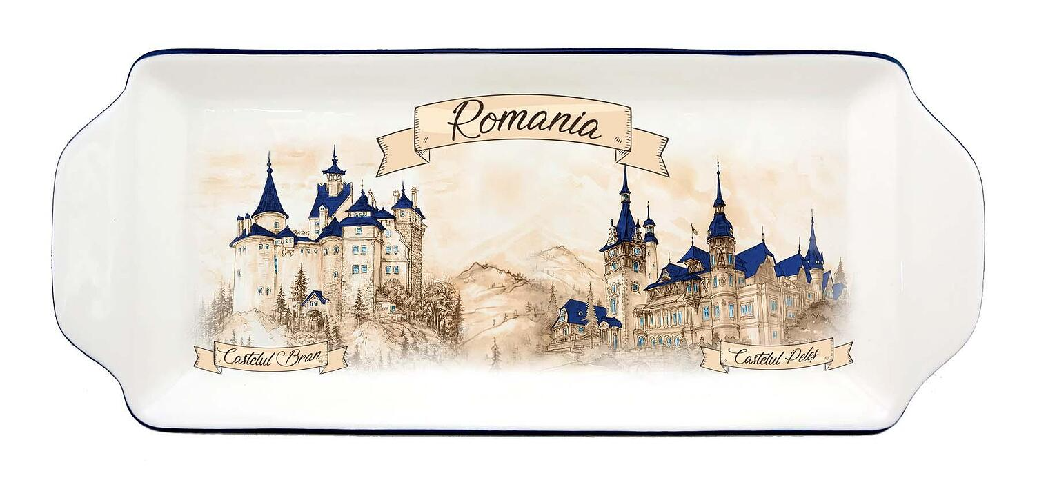 Pentru iubitorii de legende, istorii interbelice si arhitectura, platoul dreptunghiular din ceramica fina, ilustrat cu Castele din Romania, este obiectul decorativ ideal pentru completarea colectiei, dar si un cadou surprinzator pentru o persoana speciala.