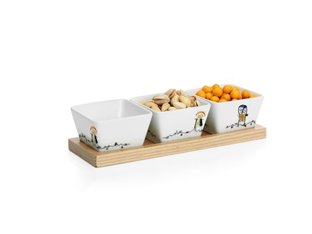 Set de 3 boluri din portelan, cu tavita din lemn, au un design vesel si colorat si sunt perfecte pentru servirea unor snackuri. Setul face parte dintr-o colectie mai mare de produse, apartinand designerului Poul Pava, un artist danez cu multiple talente: grafician, poet, muzician de jazz. Sursa de inspiratie pentru aceste colectii, este perioada copilariei, cu figuri vesele si jucause.
