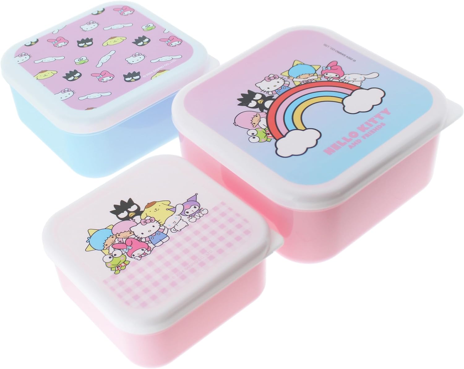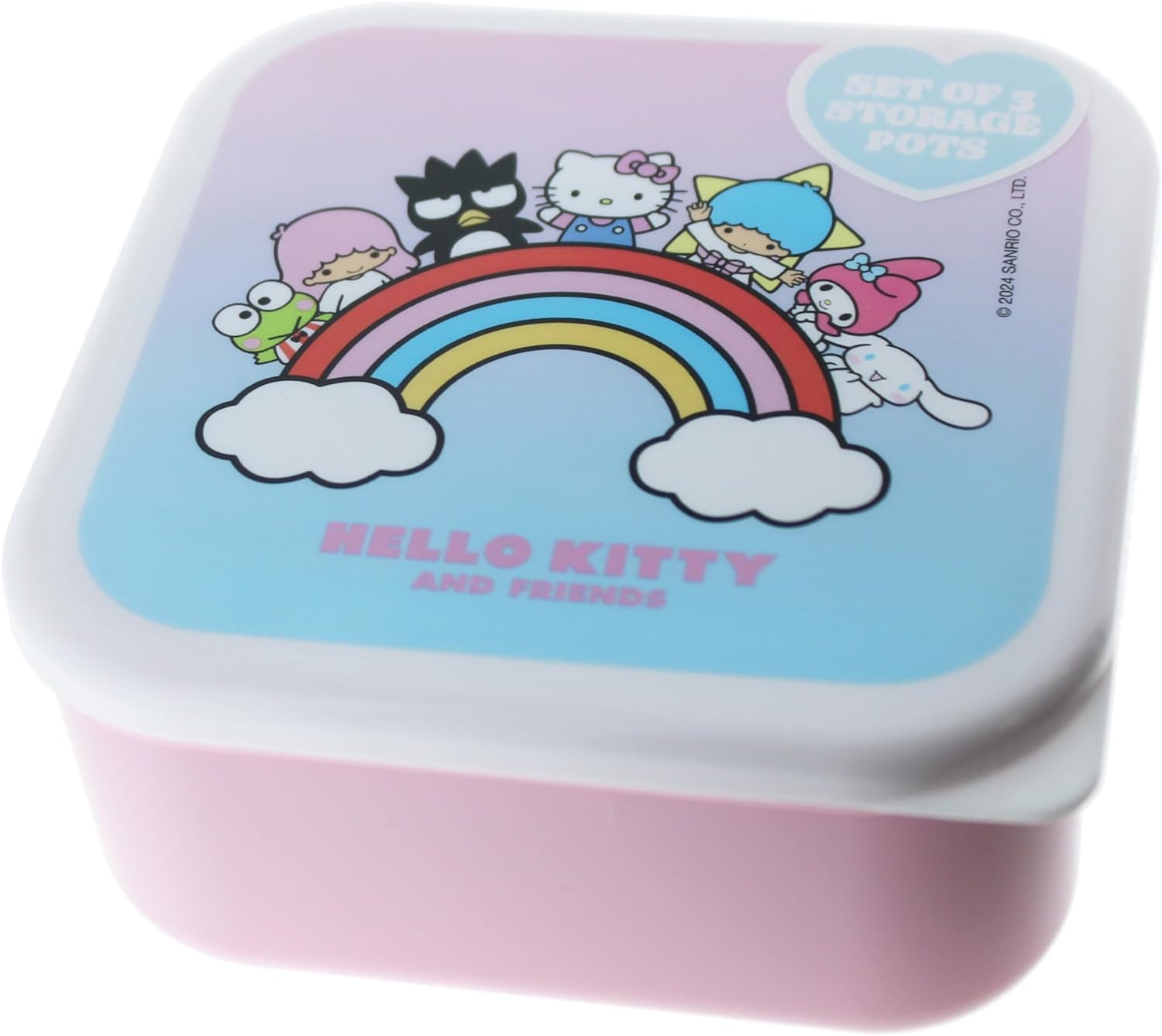 Set de 3 cutii pentru prânz cu prietenii Hello Kitty cu dimensiuni de la 8 x 8 cm până la 11 x 11 cm.