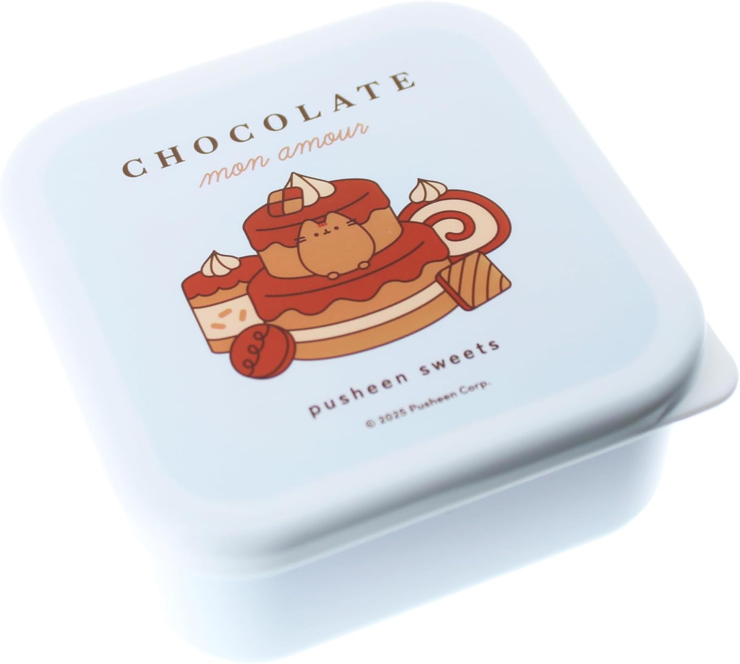 Fiecare capac de cutie prezintă un design diferit de dulciuri Pusheen, precum și inscripțiile „Pusheen Macarons/Sweet Moments”, „Chocolate Mon Amour/Pusheen Sweets” și „Have a little treat/Pusheen Sweets”.