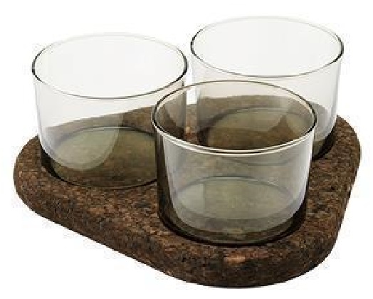 Pahare din sticlă fumurie cu tavă din plută, realizate manual.