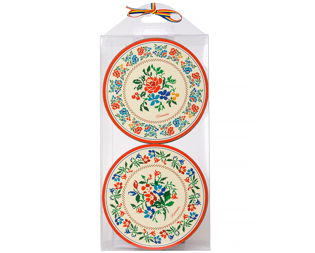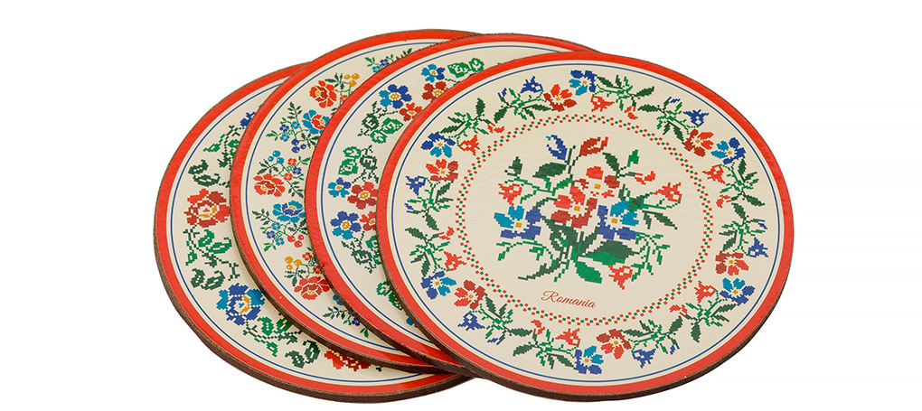 Frumusețe florală, motive fitomorfe, cu o estetică aparte, stilizate excepțional. Suporturile de pahare sunt realizate dintr-un material dur, făcut din fibră de lemn presat.